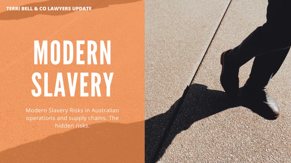 Terri Bell & Co can provide assistance and advice to entities or businesses that need to comply with the Modern Slavery Act 2018 (Cth) or those businesses simply wishing to consider the risks of modern slavery occurring in their own supply chains. In particular, our team can assist with: